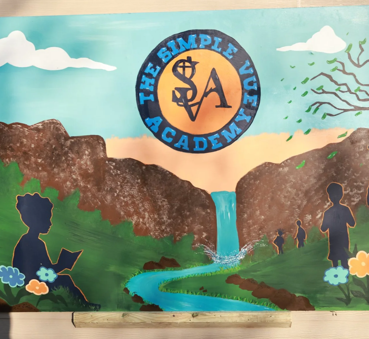 A permanent 4×8 ft panel installation designed around the school's S.T.R.E.A.M. curriculum — exploring self-efficacy, economic empowerment, and what it means to invest in your community. Fabricated as a movable panel system so the piece can travel with the school as it grows.